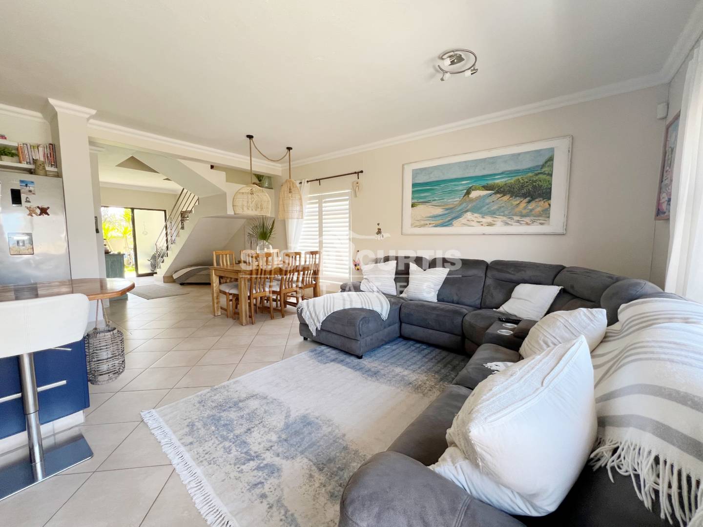 The living room opens onto a wooden deck, ideal for outdoor gatherings and relaxed evenings. A single garage provides secure parking and additional storage.