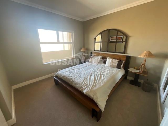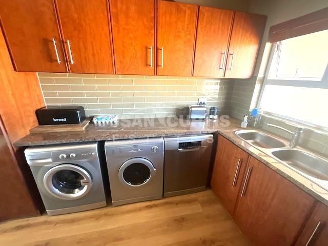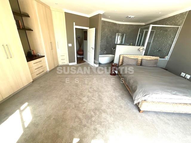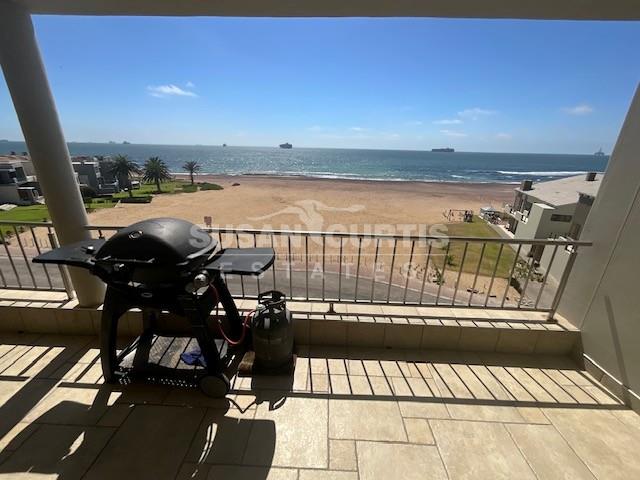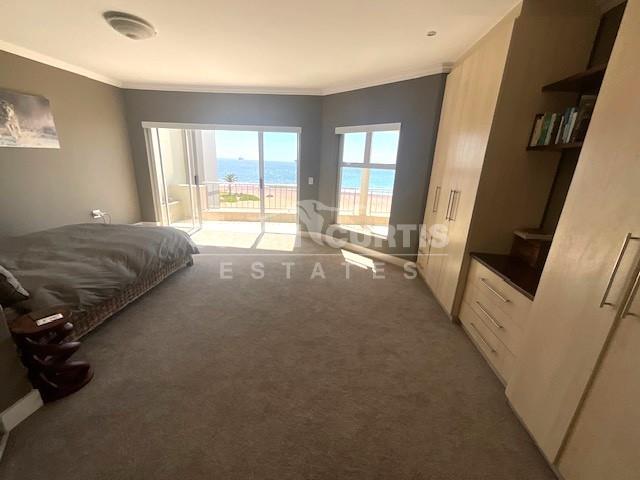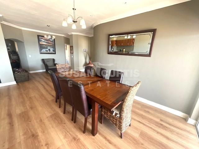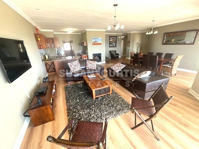 Open plan kitchen with scullery, lounge and dining area with sliding doors leading out onto a balcony with a beautiful sea view.