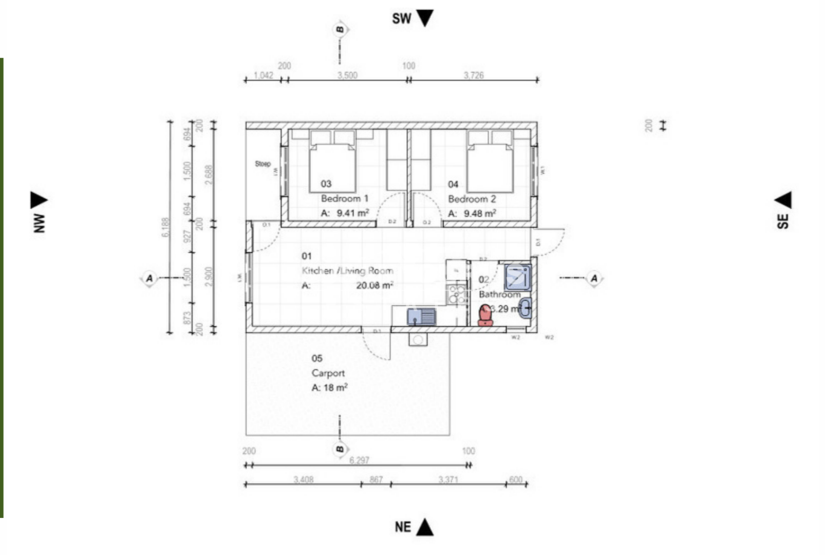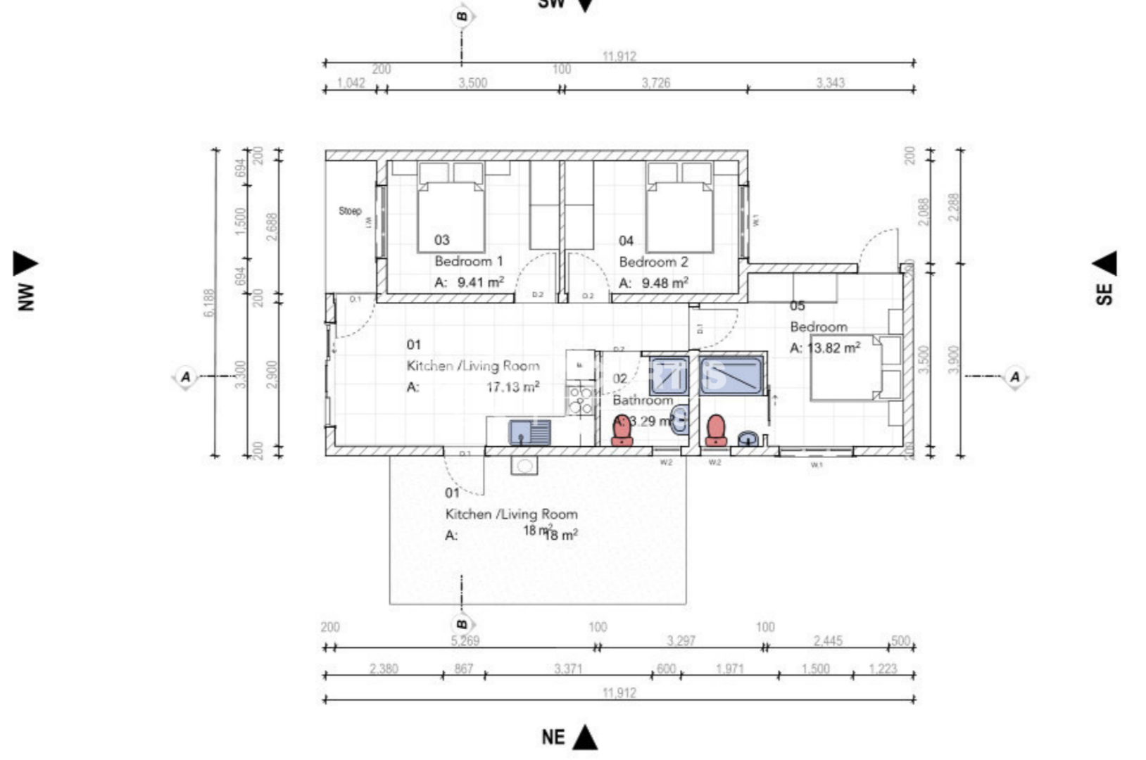 - Open-plan kitchen and living area (approx. 17–18 m2)