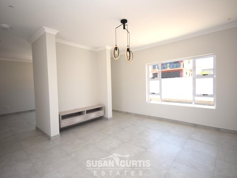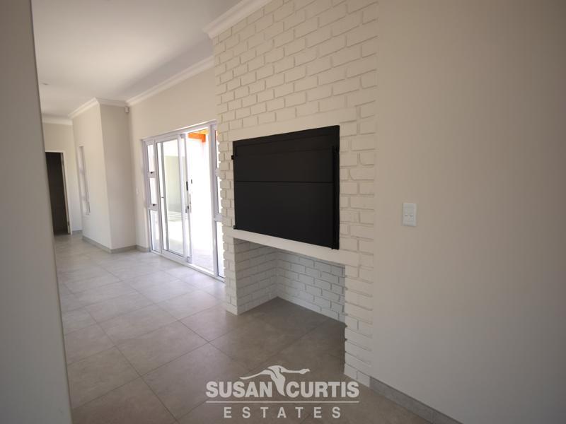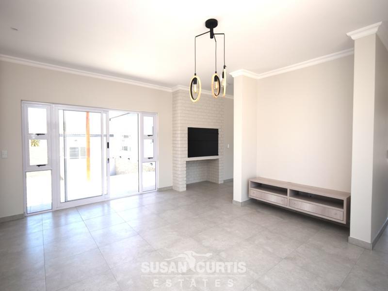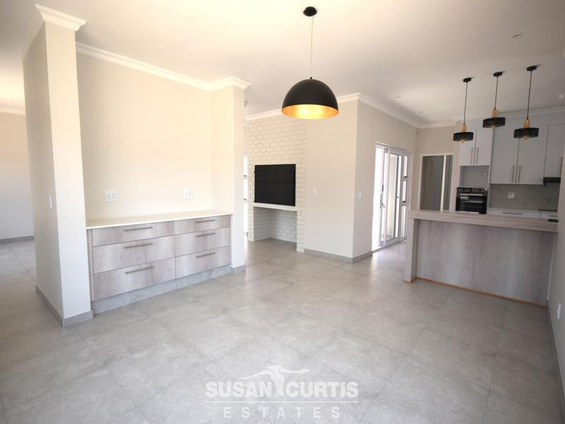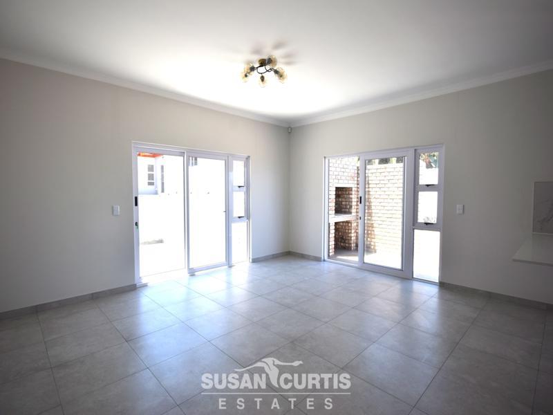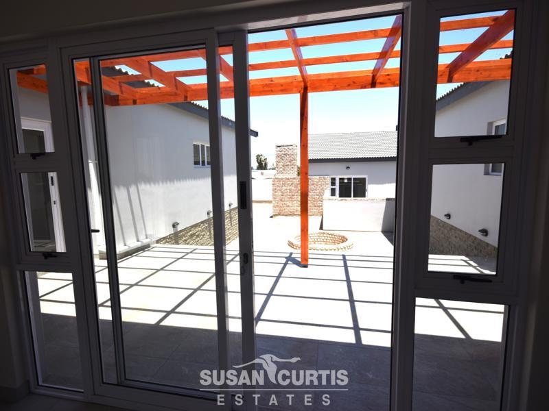 # Bright Living area and dining, with large windows and sliding doors leading to a pergola patio and boma area.