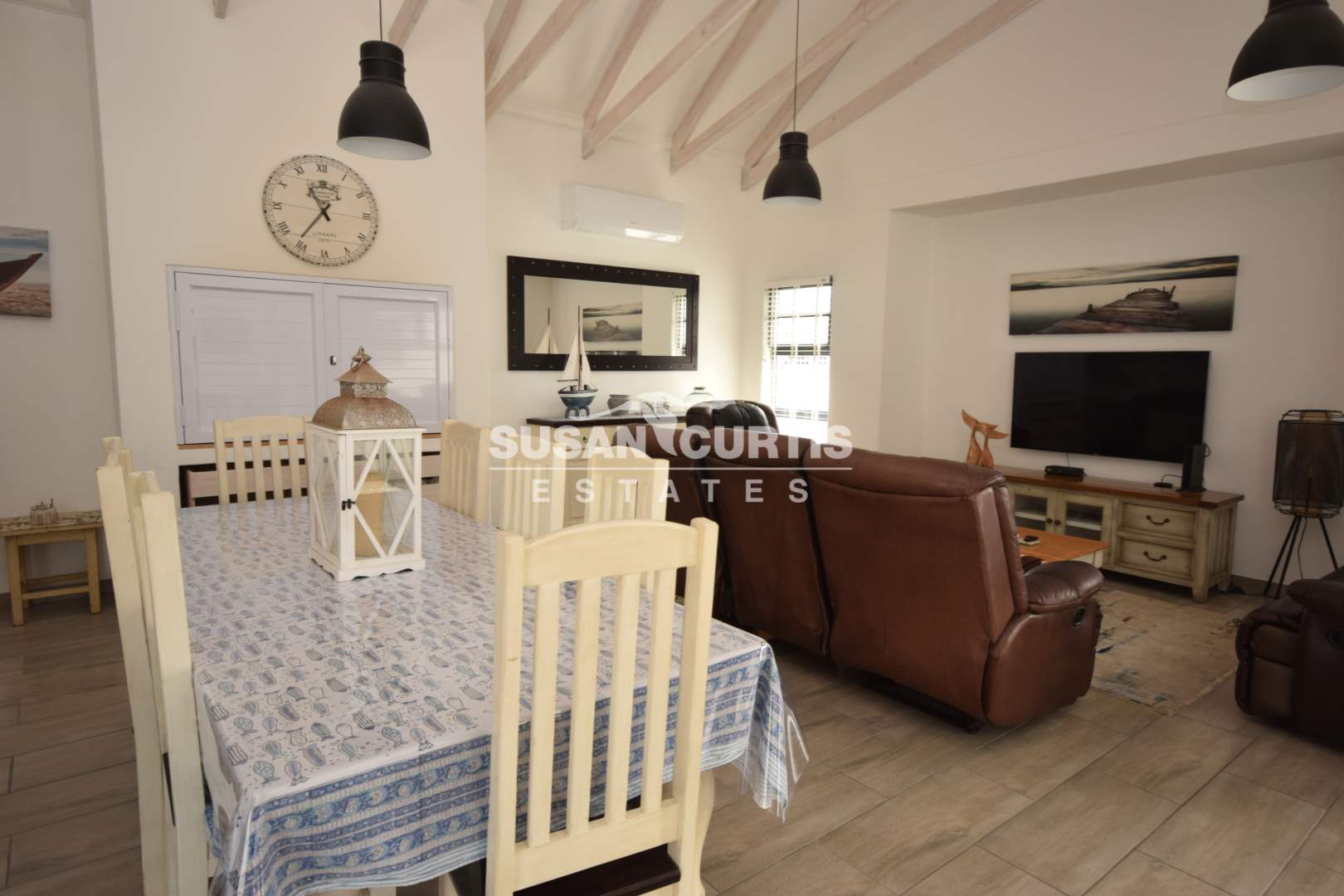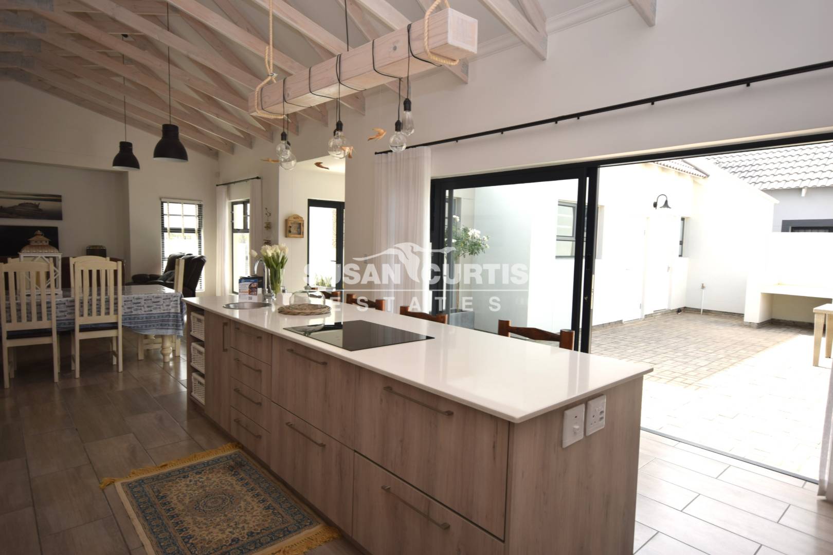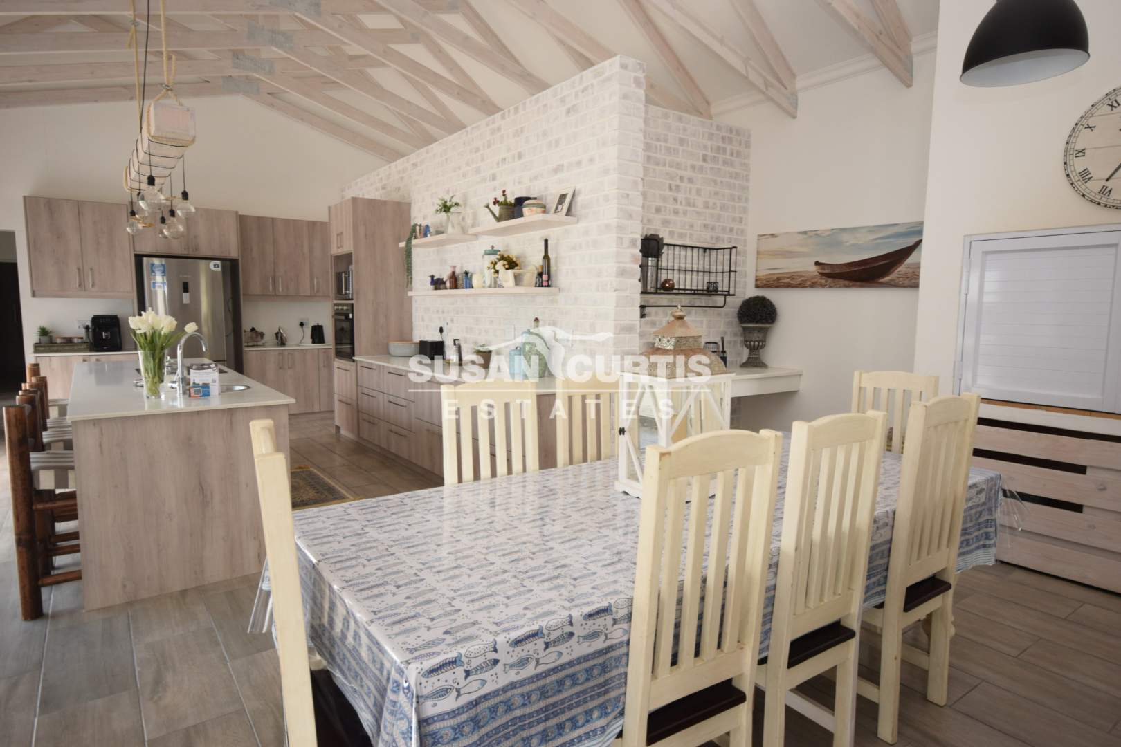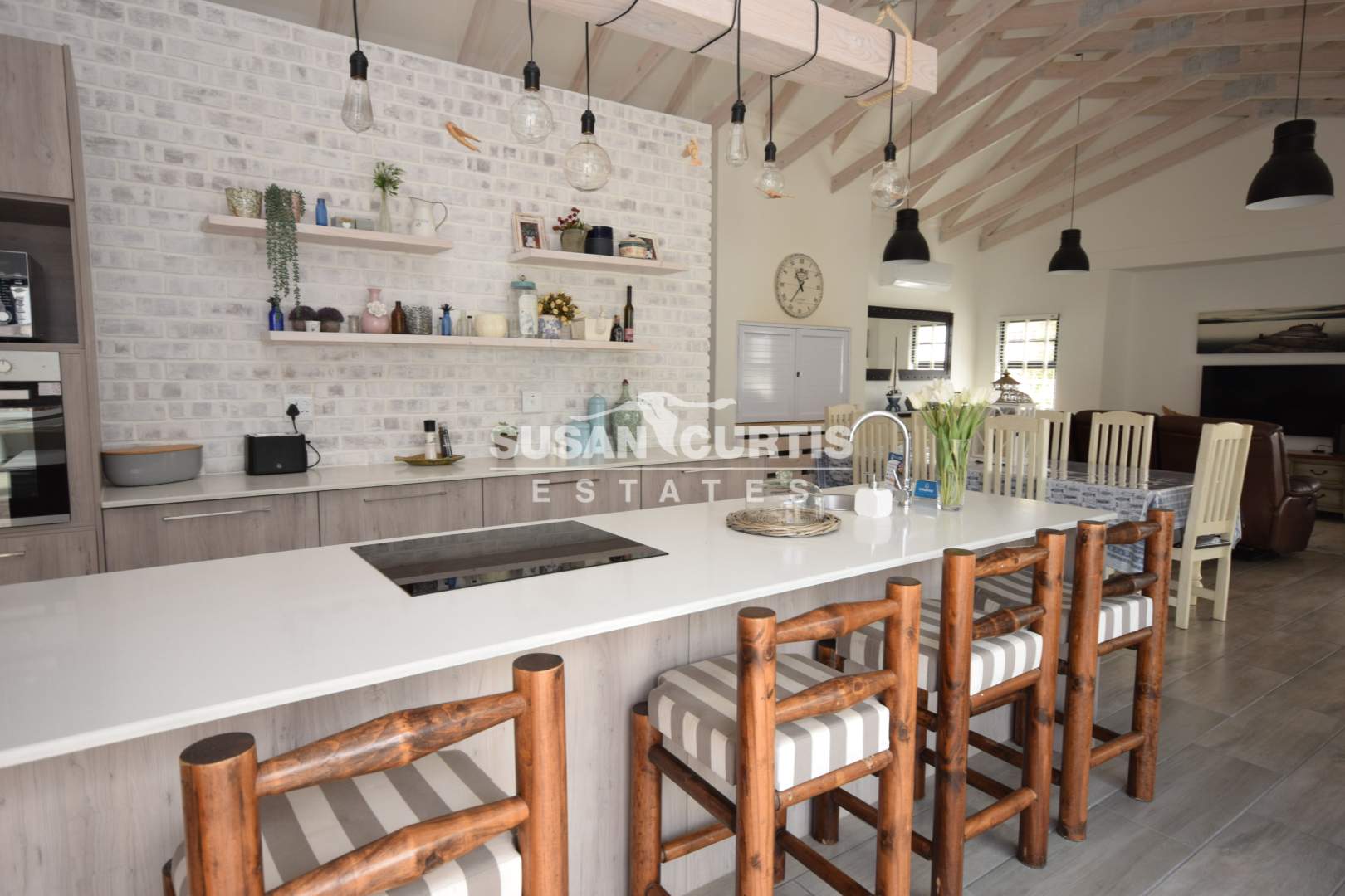# Large open plan Living area with exposed wood trusses, catering for Lounge, Dining area and beautiful Kitchen with breakfast nook.