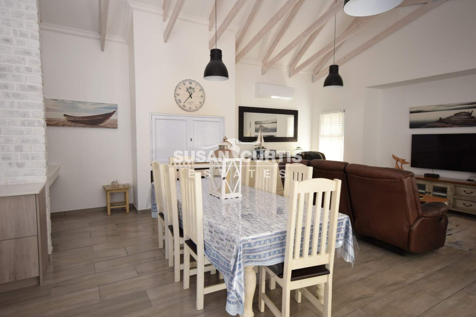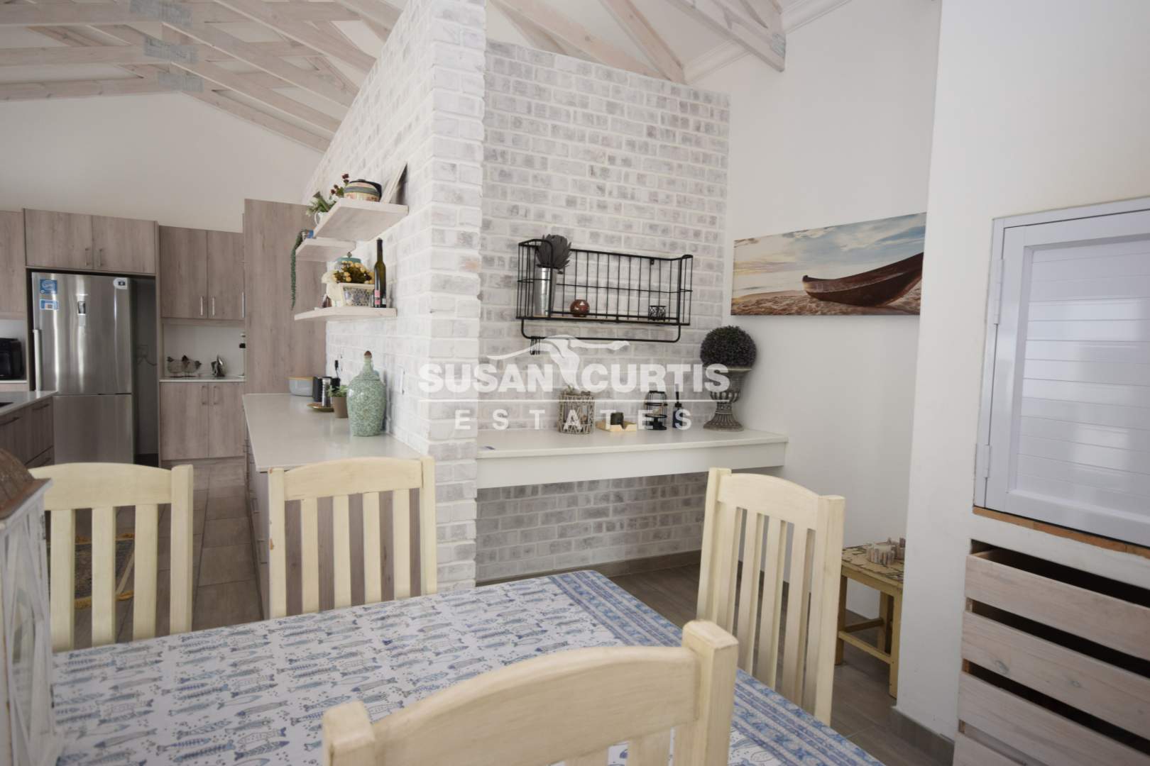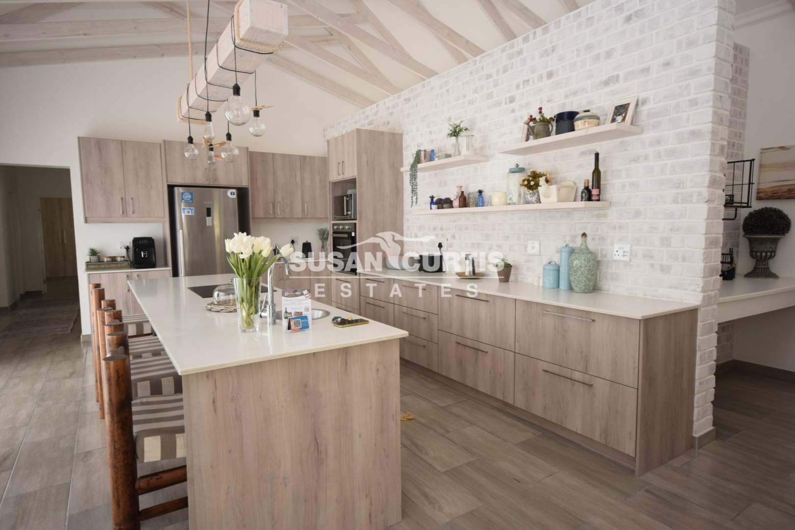 # Large open plan Living area with exposed wood trusses, catering for Lounge, Dining area and beautiful Kitchen with breakfast nook.