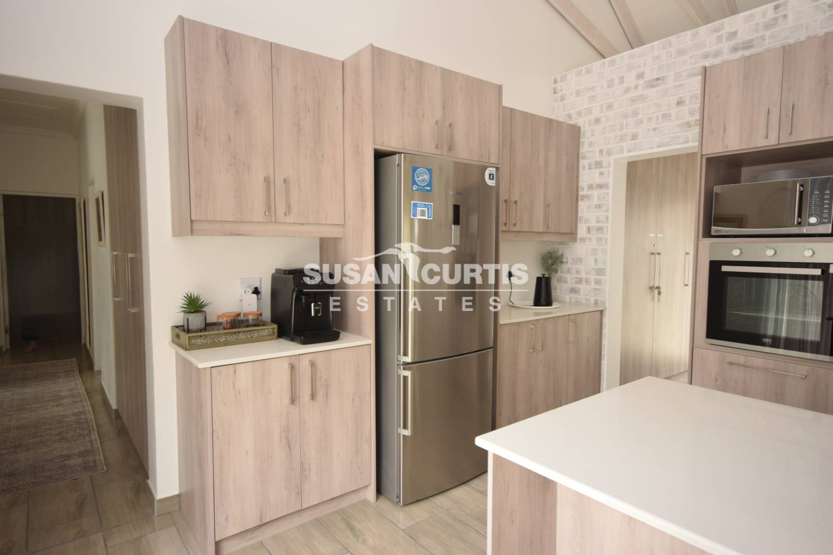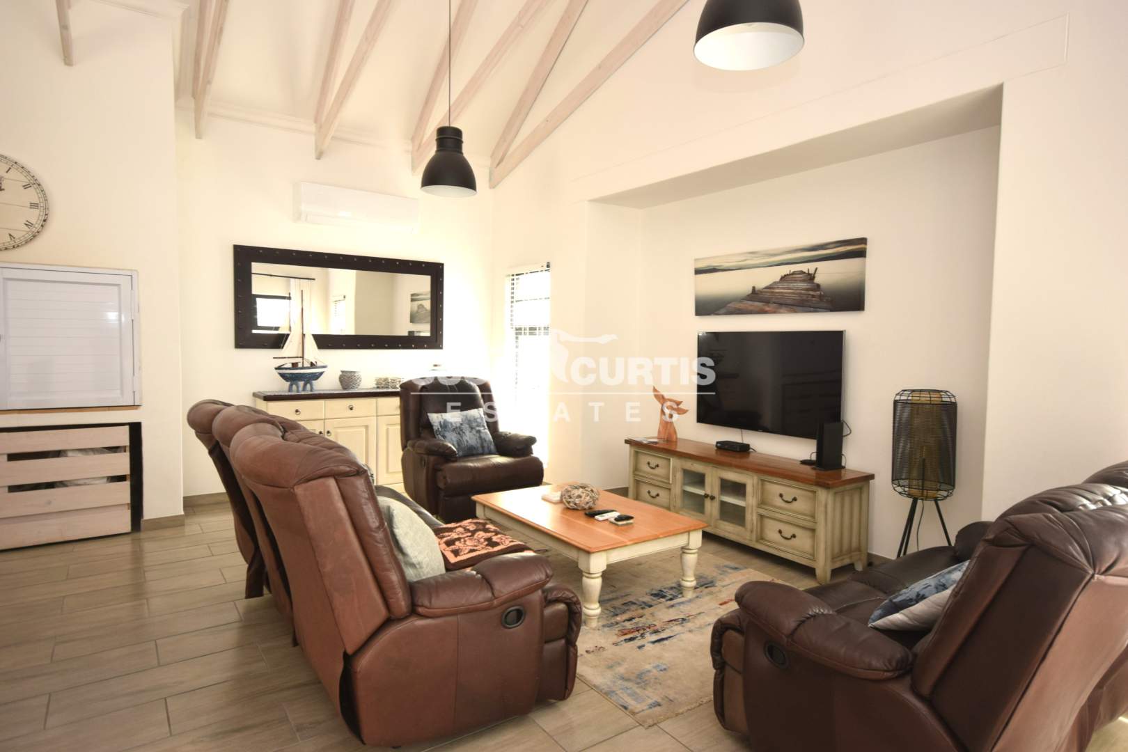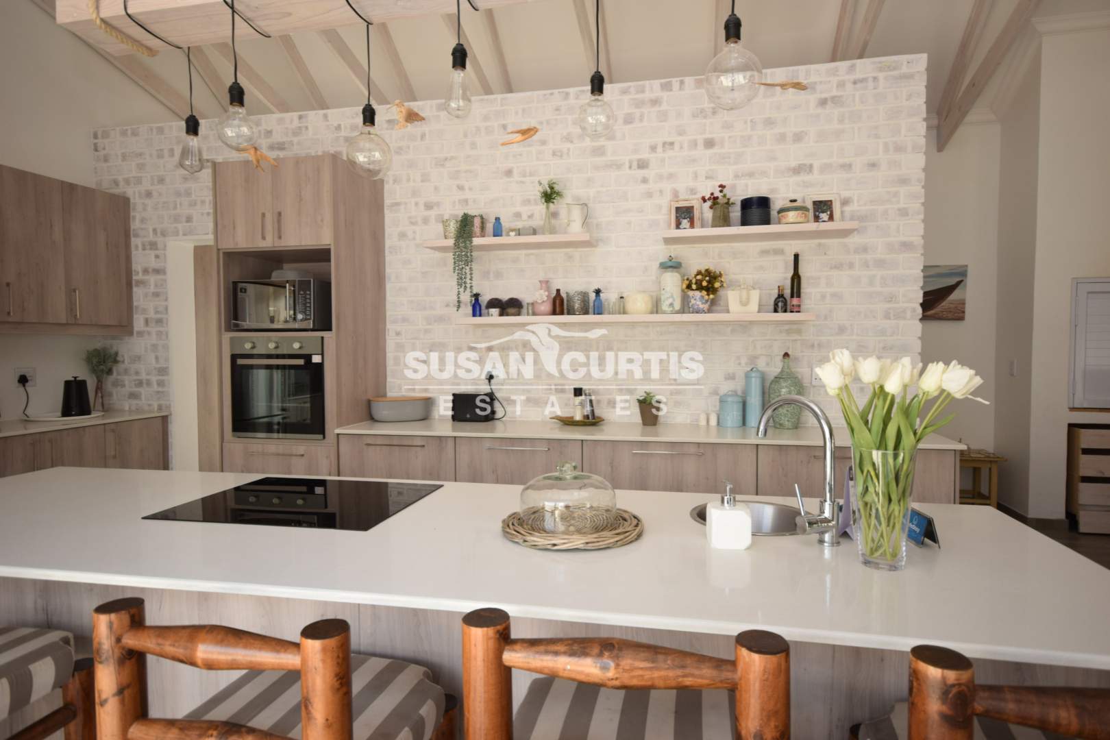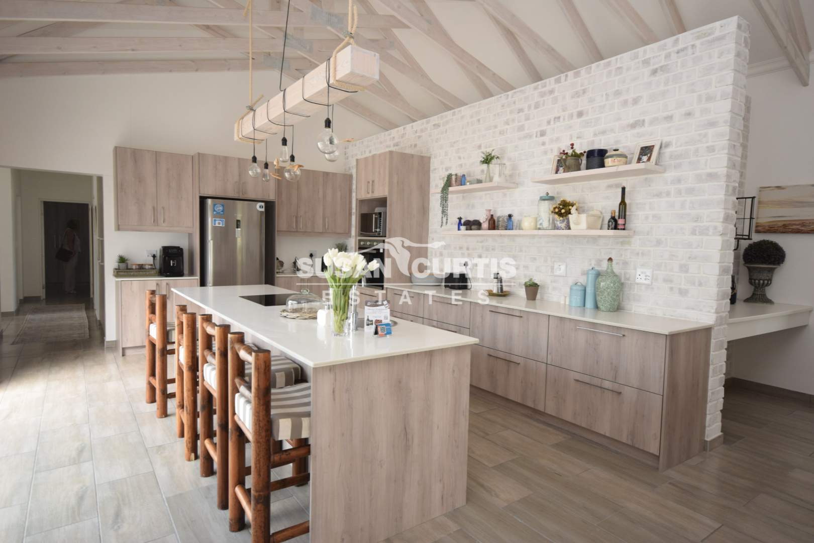 # Large open plan Living area with exposed wood trusses, catering for Lounge, Dining area and beautiful Kitchen with breakfast nook.